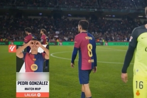 体育资讯4月23日讯 西甲第33轮比赛,佩德里踢满全场,帮助巴萨主场1-0击败马洛卡,他当选本场比赛最佳球员。